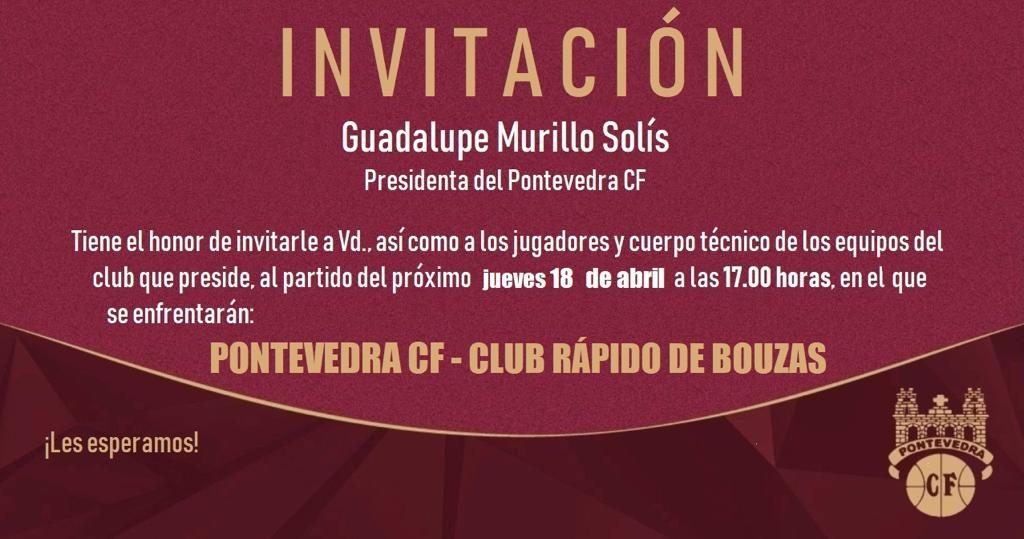 Desde el Pontevedra CF nos ponemos en contacto con vuestro Club para invitaros a presenciar un partido ilusionante para nosotros. Nos enfrentamos al Club rápido de Bouzas ( JUEVES 18 DE ABRIL A LAS 17,00 HORAS EN EL ESTADIO MUNICIPAL DE PASARÓN ) y nuestro objetivo es mantenernos en los puestos de promoción de ascenso, actualmente somo cuartos en la clasificación general con 56 puntos empatados con el tercero que es la Ponferradina.